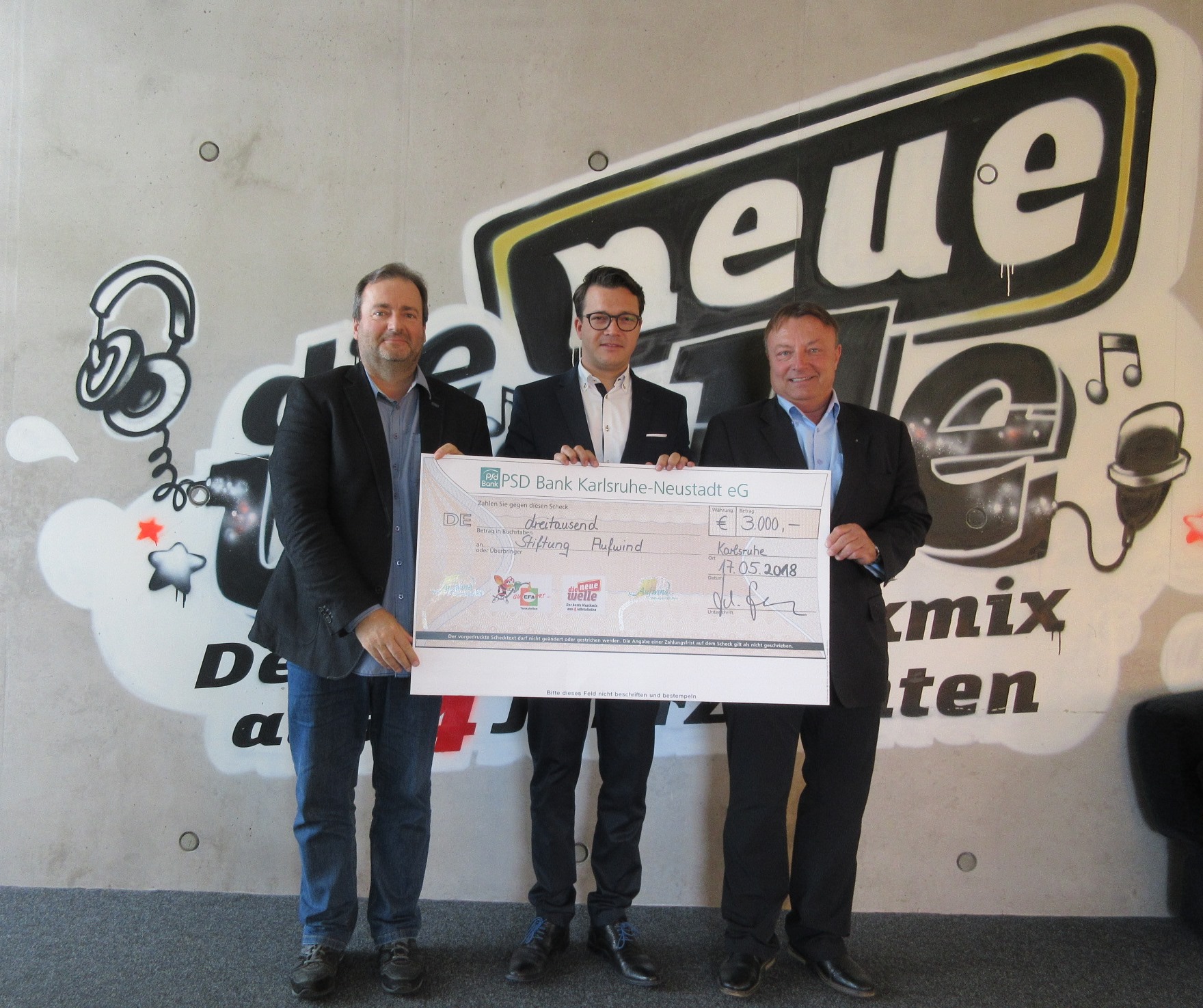 Robin Schuster, Geschäftsführung der neuen welle und Wolfgang Fahrer, Geschäftsführer der EFA-Tankstellenbetriebe und Mineralölhandel GmbH übergaben den Scheck am heutigen Donnerstag an Bernhard Slavetinsky, Vorstandsvorsitzender der PSD Bank Karlsruhe-Neustadt eG und der Stiftung Aufwind.